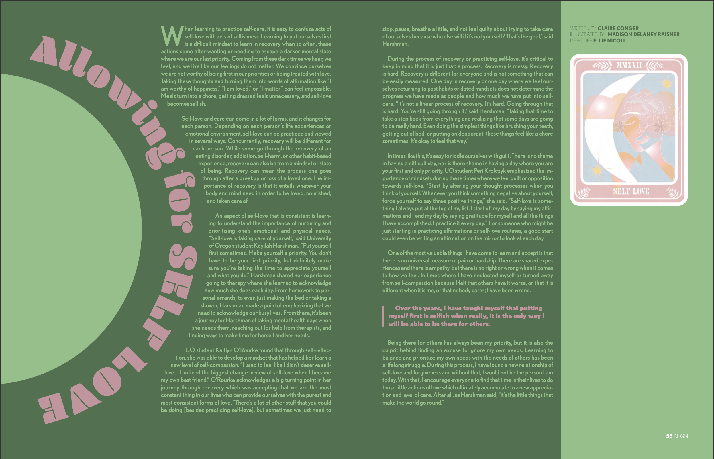 UO student Kaitlyn O’Rourke found that through self-reflection, she was able to develop a mindset that has helped her learn a new level of self-compassion. “I used to feel like I didn’t deserve self-love... I noticed the biggest change in view of self-love when I became my own best friend.” O’Rourke acknowledges a big turning point in her journey through recovery which was accepting that we are the most constant thing in our lives who can provide ourselves with the purest and most consistent forms of love. “There's a lot of other stuff that you could be doing [besides practicing self-love], but sometimes we just need to stop, pause, breathe a little, and not feel guilty about trying to take care of ourselves because who else will if it's not yourself? That’s the goal,” said Harshman.