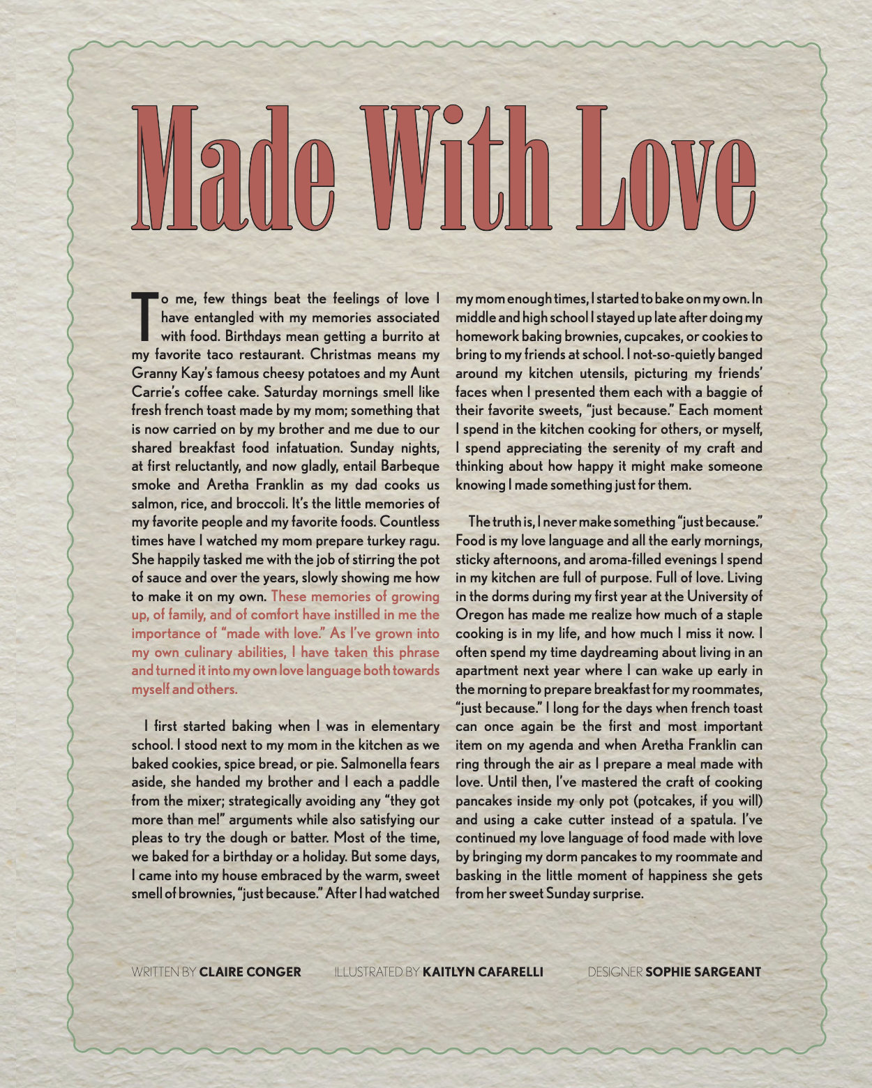 These memories of growing up, of family, and of comfort have instilled in me the importance of “made with love.” As I’ve grown into my own culinary abilities, I have taken this phrase and turned it into my own love language both towards myself and others.